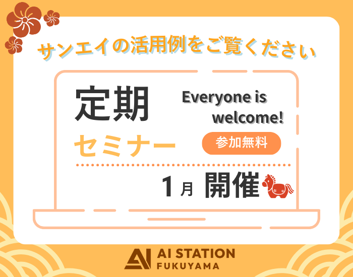 AI-STATION fukuyamaの12月セミナーを開催します! 株式会社サンエイは「働くAI 交流ひろば」をコンセプトに、メーカーの垣根を超え、AIに特化したDXショールーム「AI-STATION fukuyama...