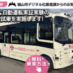 2026年2月12日 / 最終更新日時 : 2026年2月12日 Bingo Digital Lab FY2025 福山市デジタル化推進課からのお知らせ! 2025年度自動運転実証実験を実施します! 運転手不足の解消などの課題に対する将来の移動手段の確保や未来のモビリティサービスの実現に向けて、バス型の自動運転車両による実証実験を実施します。 今年度は運転手が乗車し必要に応 […]